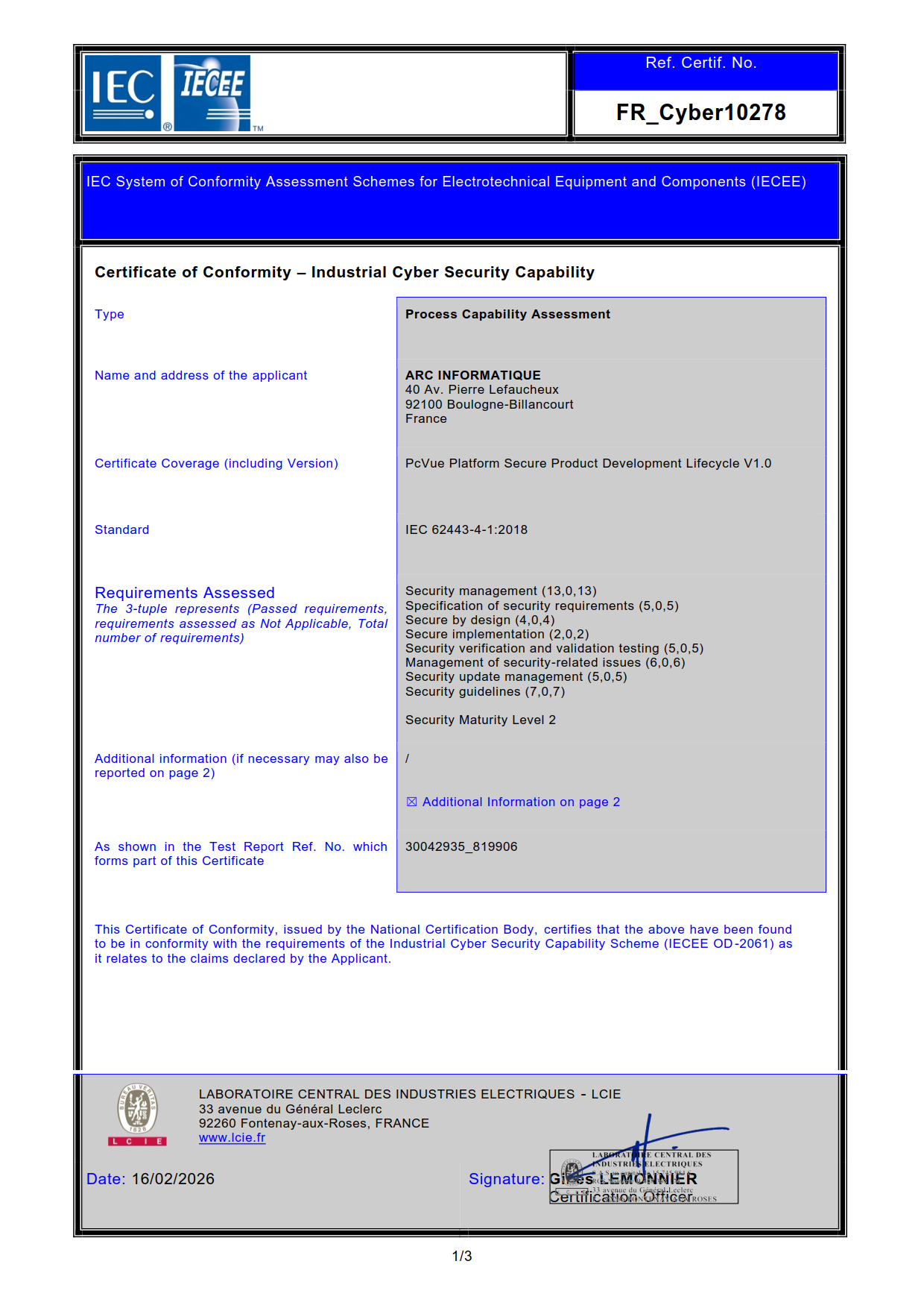 PcVue 已通过 IEC 62443-4-1:2018 认证。该国际标准明确规定了工业自动化与控制系统(IACS) 产品安全开发生命周期的相关要求。